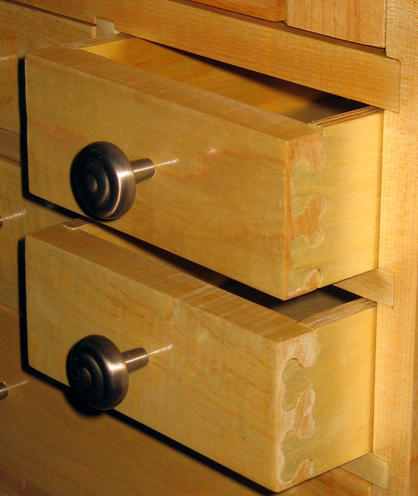 Close up of "bear-ears" half-blind dovetails on drawers. |