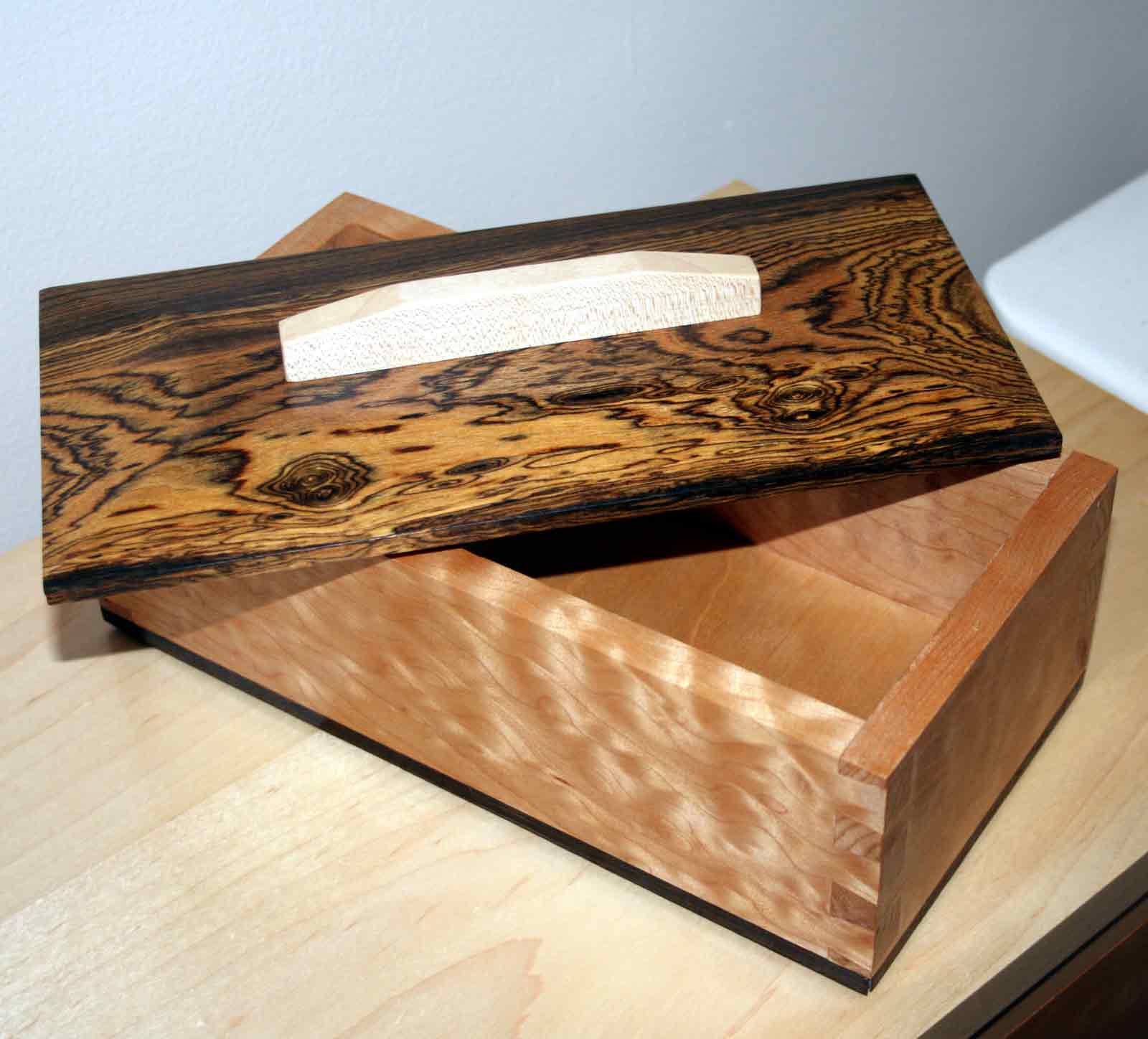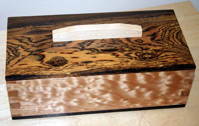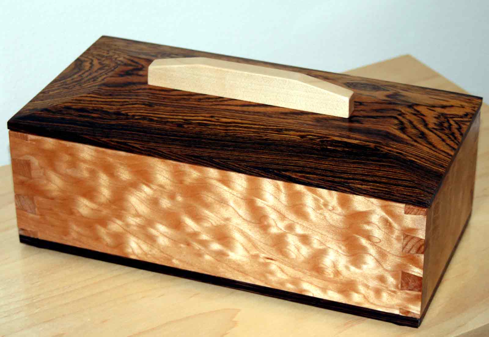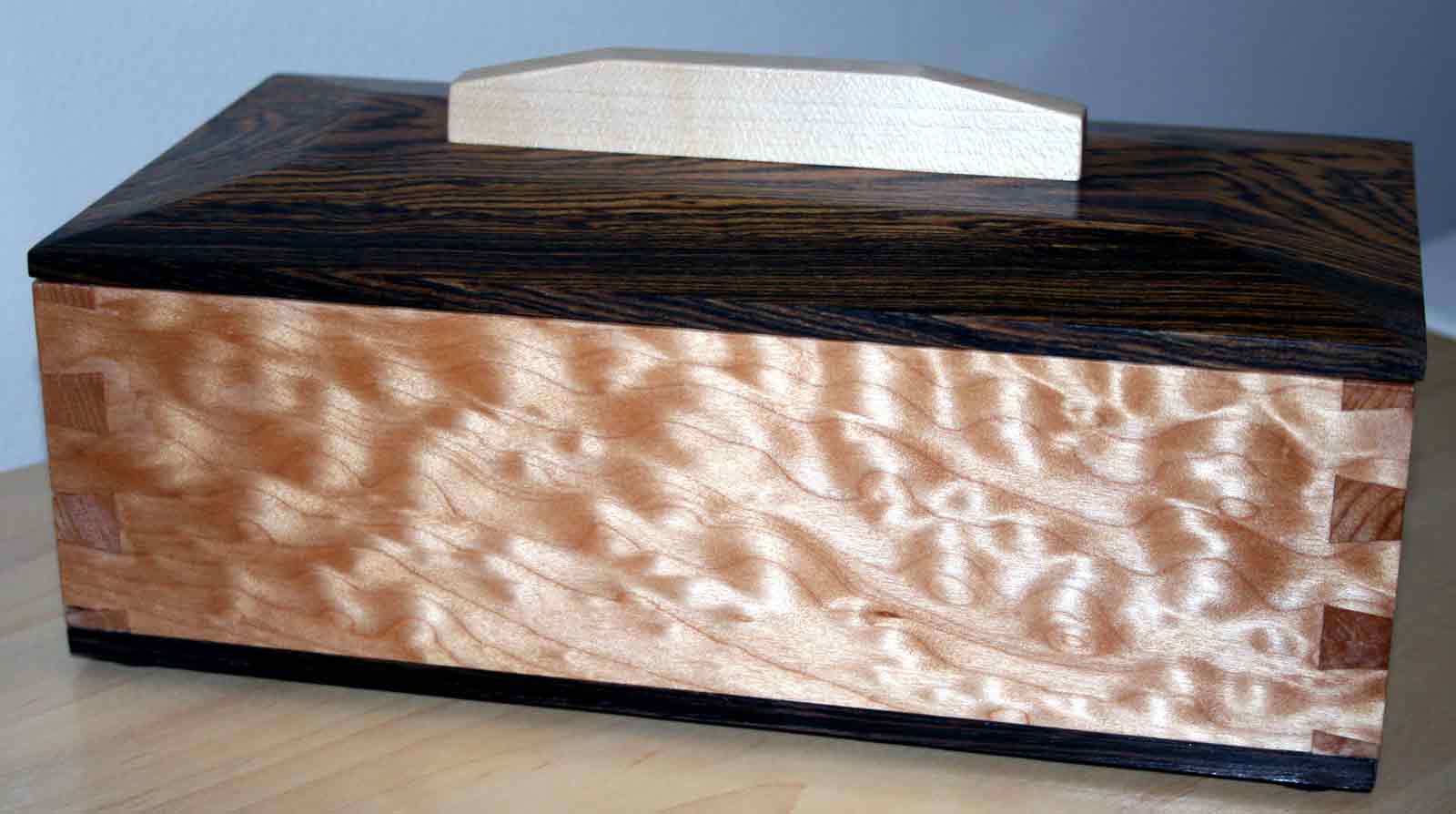 Small box, 10 1/4 x 5 1/8 x 4". Front and sides are quilted maple with dove-tail joints. Base is wenge. Lid is bocote with a hard maple handle.